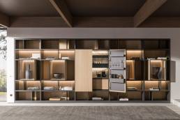 All’interno del sistema 505 UP prende vita anche Harry’s Bar, reinterpretazione contemporanea di un grande classico degli spazi living. Un modulo indipendente che si apre con ampie porte a cerniera invisibile, rivelando un compartimento interno attrezzato con mensole, cassetti e spazi dedicati a bottiglie e utensili.