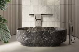 La vasca freestanding ne rappresenta il simbolo più iconico: un elemento scultoreo capace di fondere comfort e design in un’unica forma armoniosa.