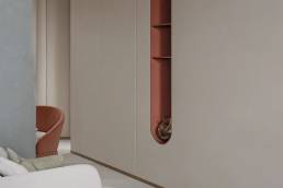 La parete smette di essere un limite per diventare un sistema progettuale. Le nicchie introducono variazioni di profondità che rompono la bidimensionalità, creando pieni e vuoti capaci di dare movimento e gerarchia allo spazio.