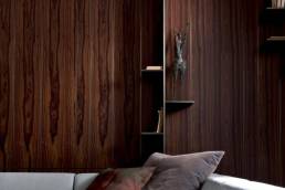 Pareti attrezzate, rientranze e volumi calibrati trasformano la superficie verticale in un elemento attivo: una struttura che disegna profondità, ritmi e relazioni visive, ridefinendo completamente la percezione dell’ambiente.